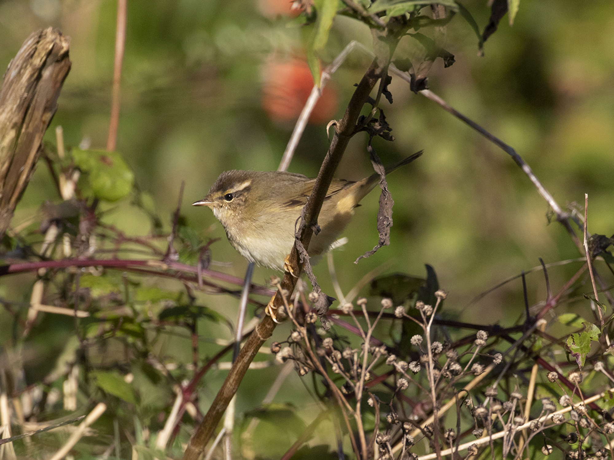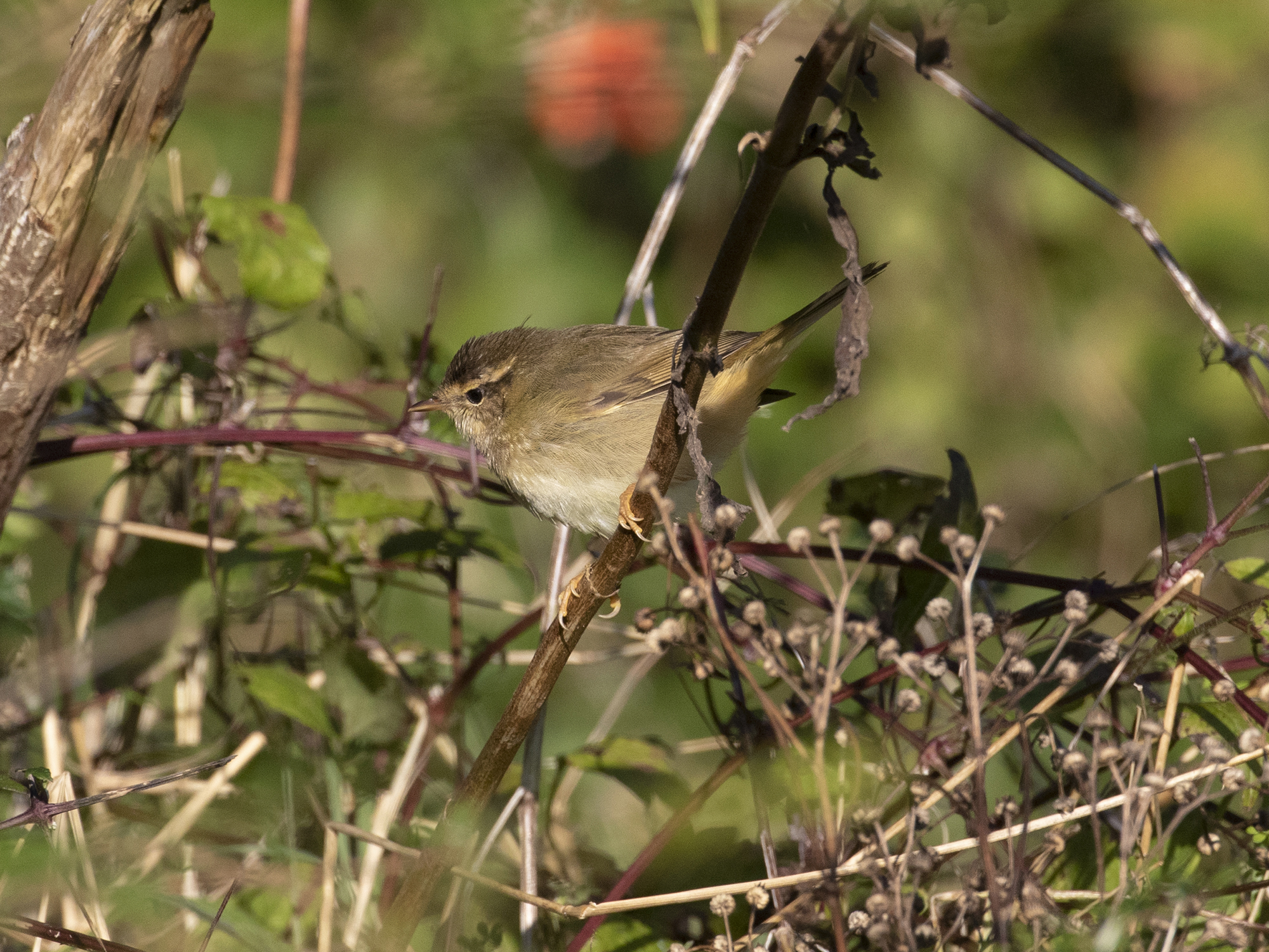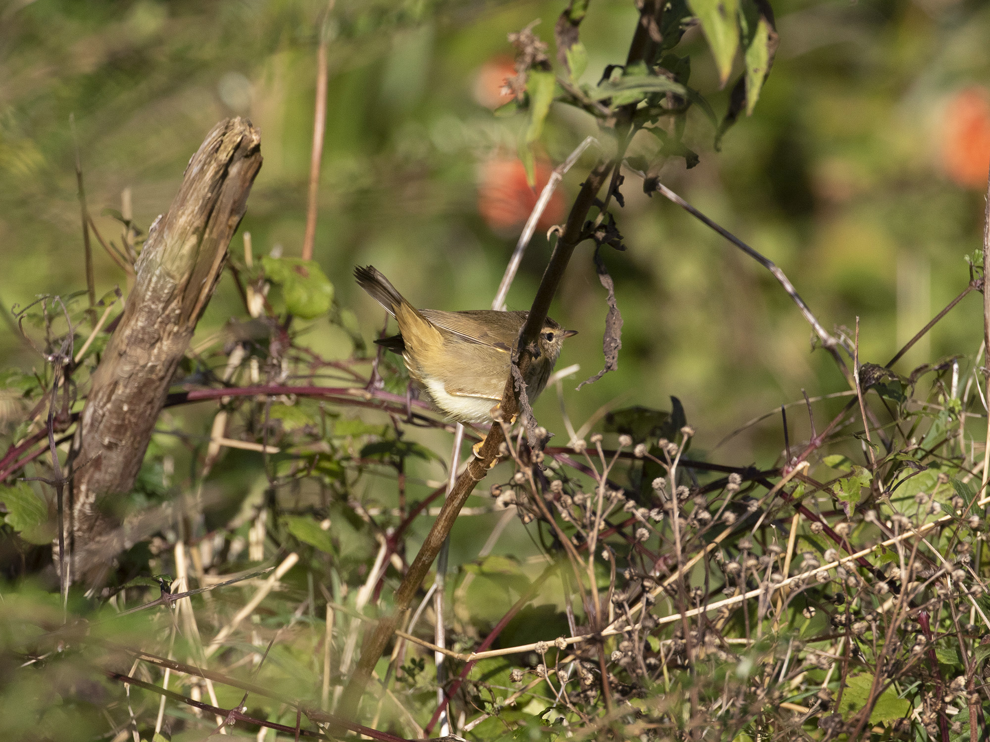 The sunny side of the valley seemed quite birdy, and a spot I rarely check held 3 Chiffchaff feeding near a small pond when suddenly movement low down caught my attention. I could see heavily obscured bits and pieces of a darkish looking phyllosc that looked to have warm grey yellow underparts and was that some apricot tones towards the vent?! a strong ‘eastern looking’ supercillium, I saw some wing flicking. then it was gone… Wobbly legs followed but then I heard it call, (a bird I’ve readied myself for finding many times before and confirming my suspicions from the brief views I’d had) A Raddes Warbler!! about 5 minutes passed before it came out into the sunshine and fed low down in the base of some willow herb; A Lovely bird.