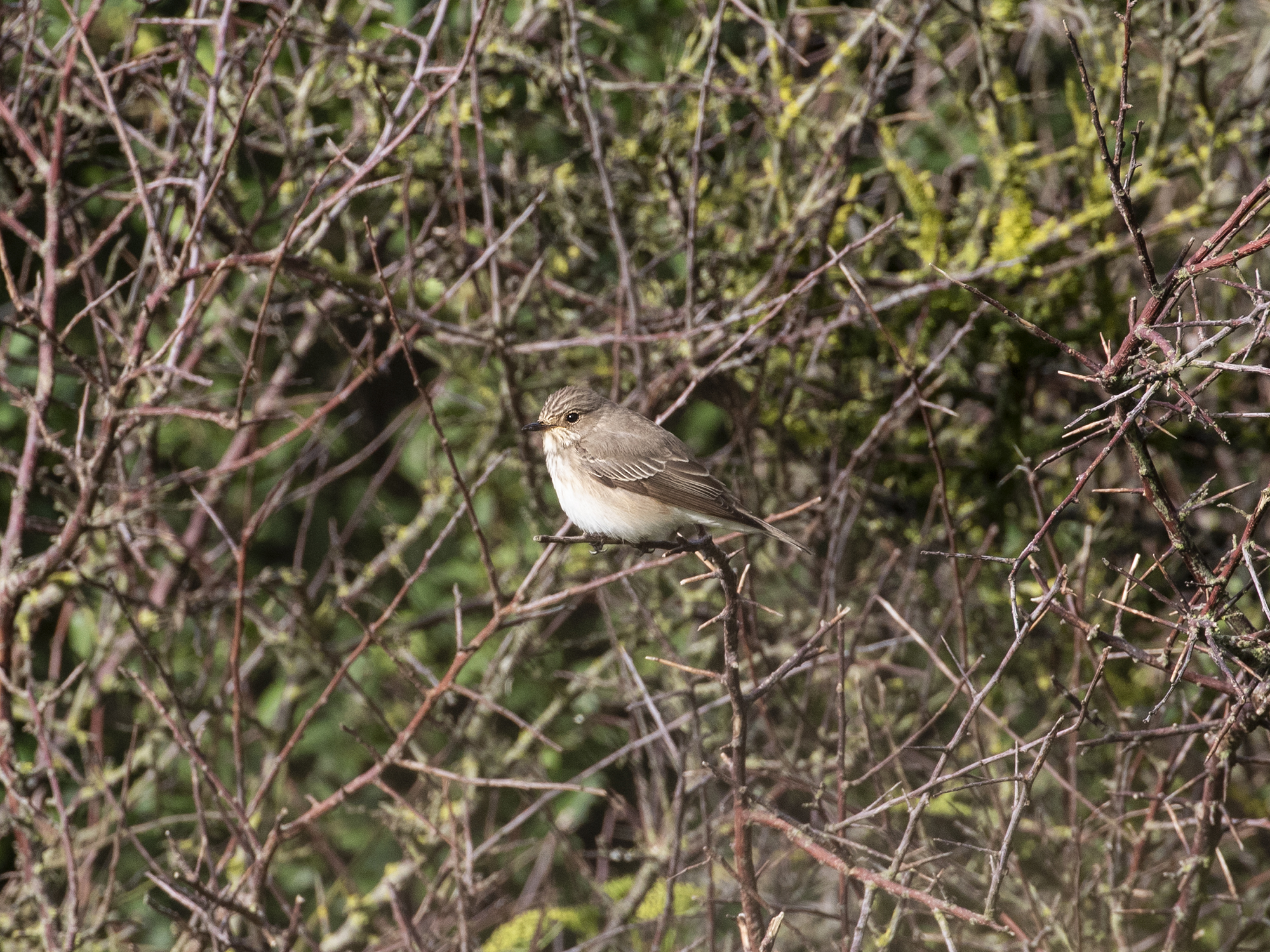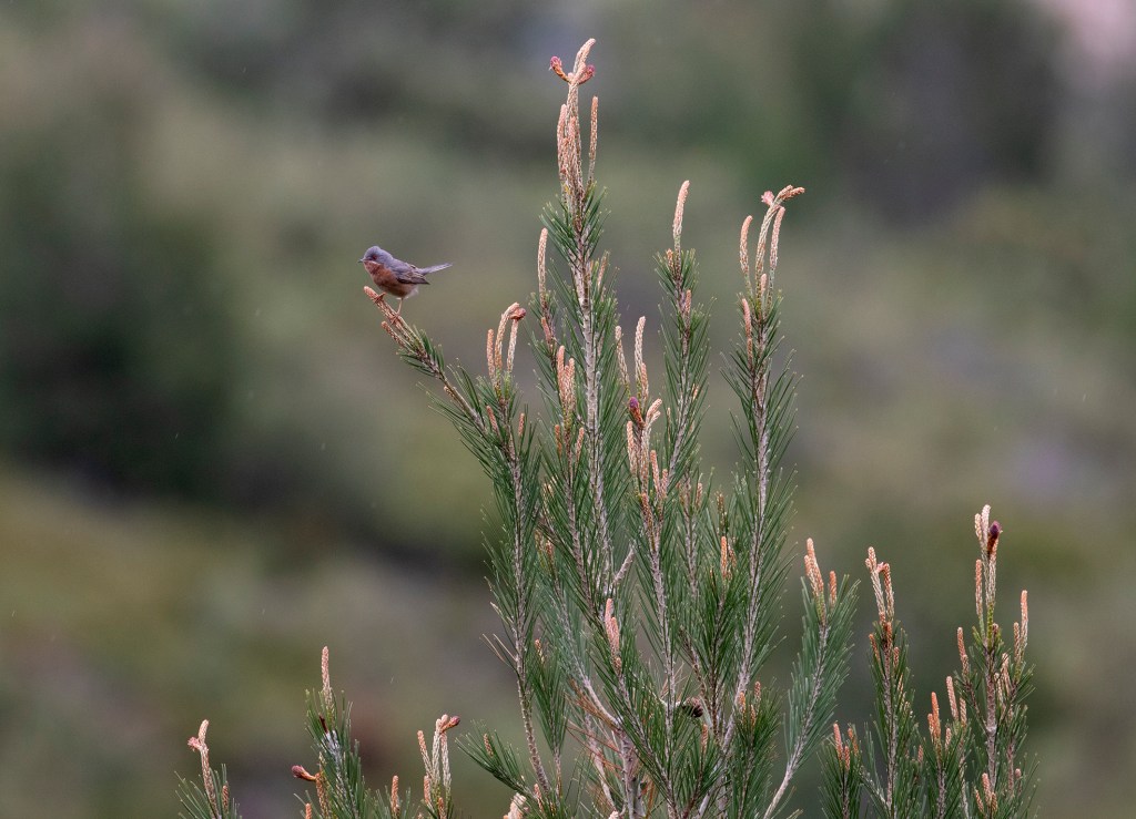 At about 10.15 this morning I heard a distant sylvia warbler singing from a line of bushes 30 ft from the cliff on Lighthouse down . At first it sounded like a small syliva singing with a rolling momentum punctuated by pauses, I could hear it wasn’t any of our common breeding sylvias but also not unfamiliar to me. At this point not distinguishable from a number of other options in that family. As I got closer and the bird continued I began to pick out the Sardinian warbler type call notes scattered within the song; stuttered harsh and rapid rattling ‘tt-tt-tt tzek’s which are audible in the video link and recordings below. The bird then went quiet and after an hour of searching I relocated it 150m down at the bottom of the valley, where it called straight up like a Sardinian Warbler several times. It was this call that I found most useful and my moment of confirmation although I still hadn’t seen the bird. I spoke to a couple of friends before putting the news out, to say the words out loud and this helped alot.