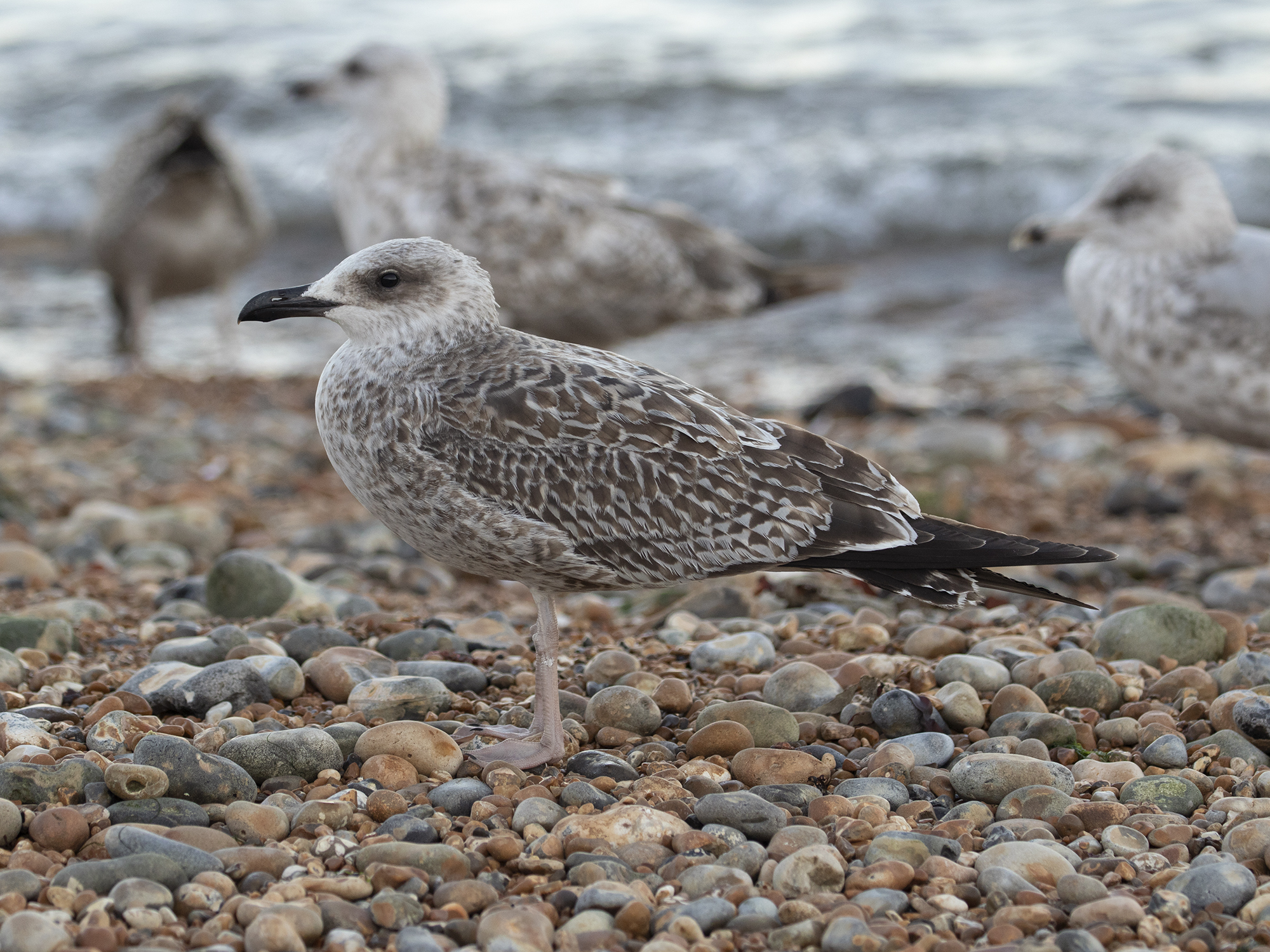 Juvenile Yellow–leggedgulls have been seen flying along the cliff tops and in the harbour but it wasnt untill today that i was able to photograph one nicely amoung the local gulls on the harbour beach, some second generation scapulars moulting through on this bird.