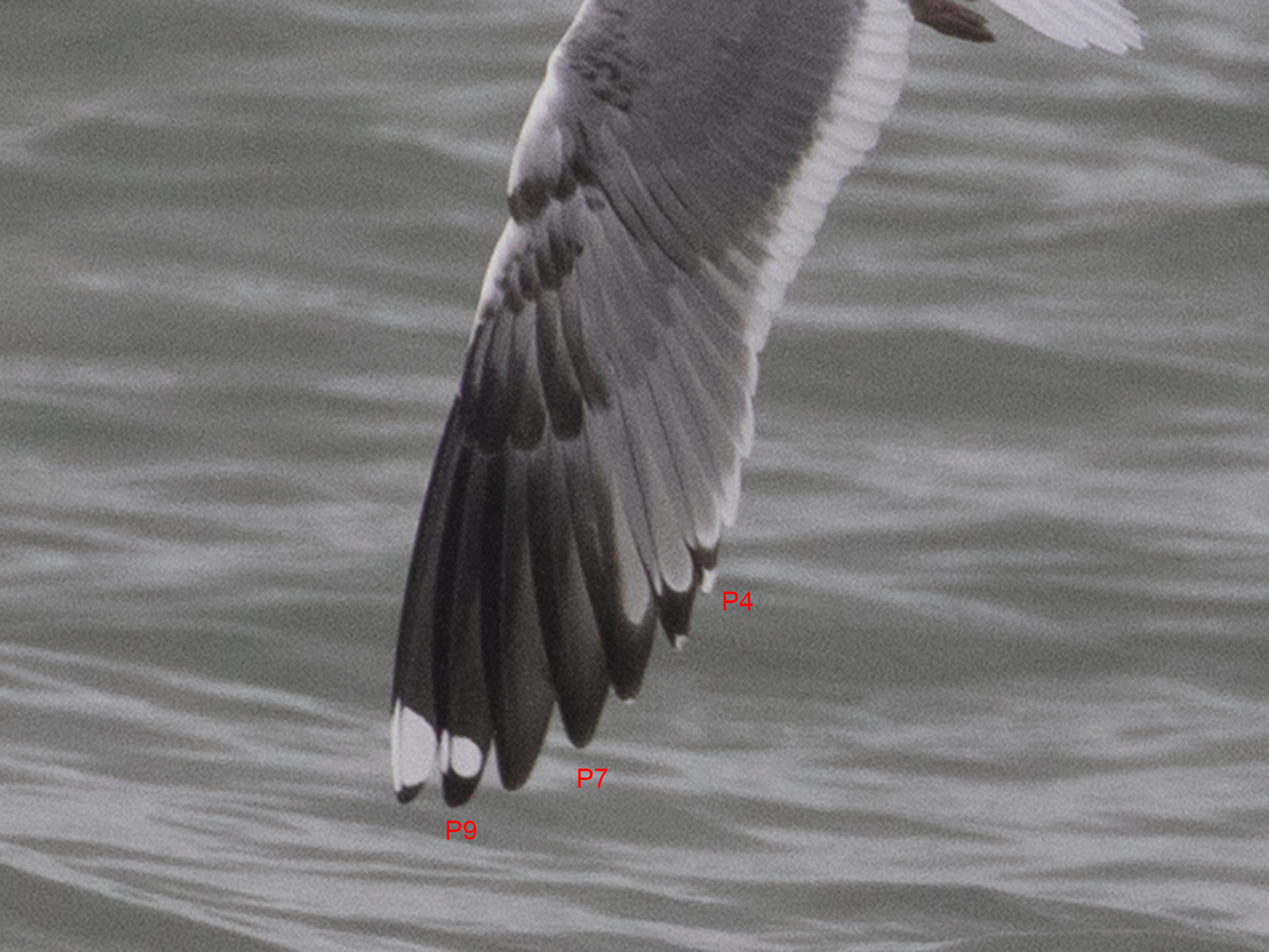 A bird showing a P9 mirror that extends onto the outer web must also show a black band on p4 and no white tongue tip to p7.