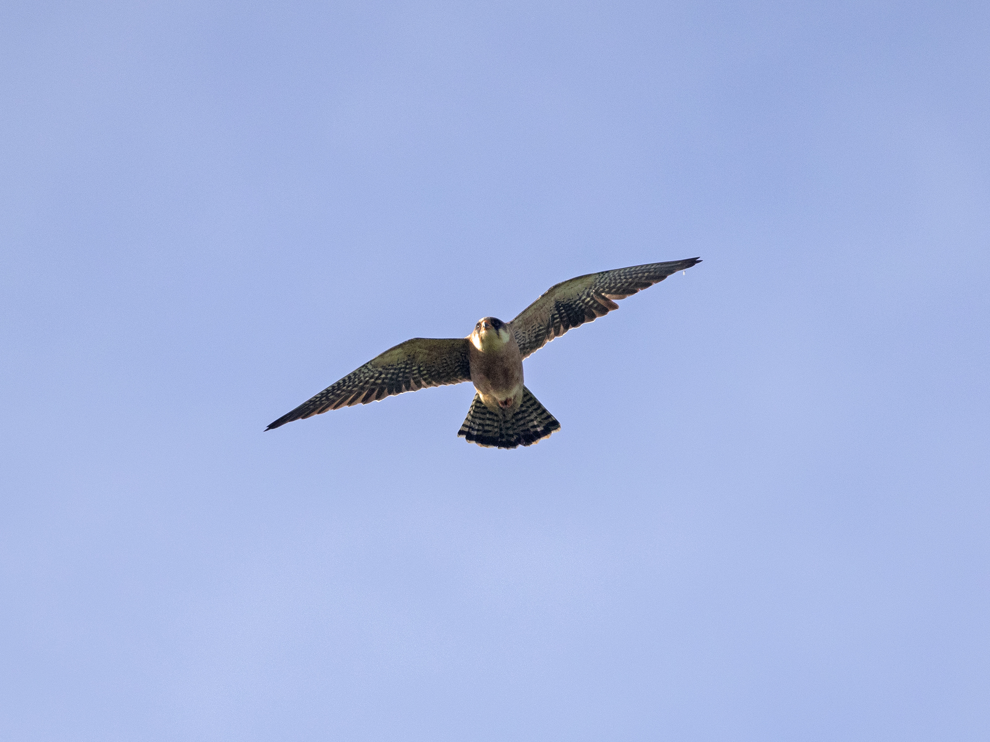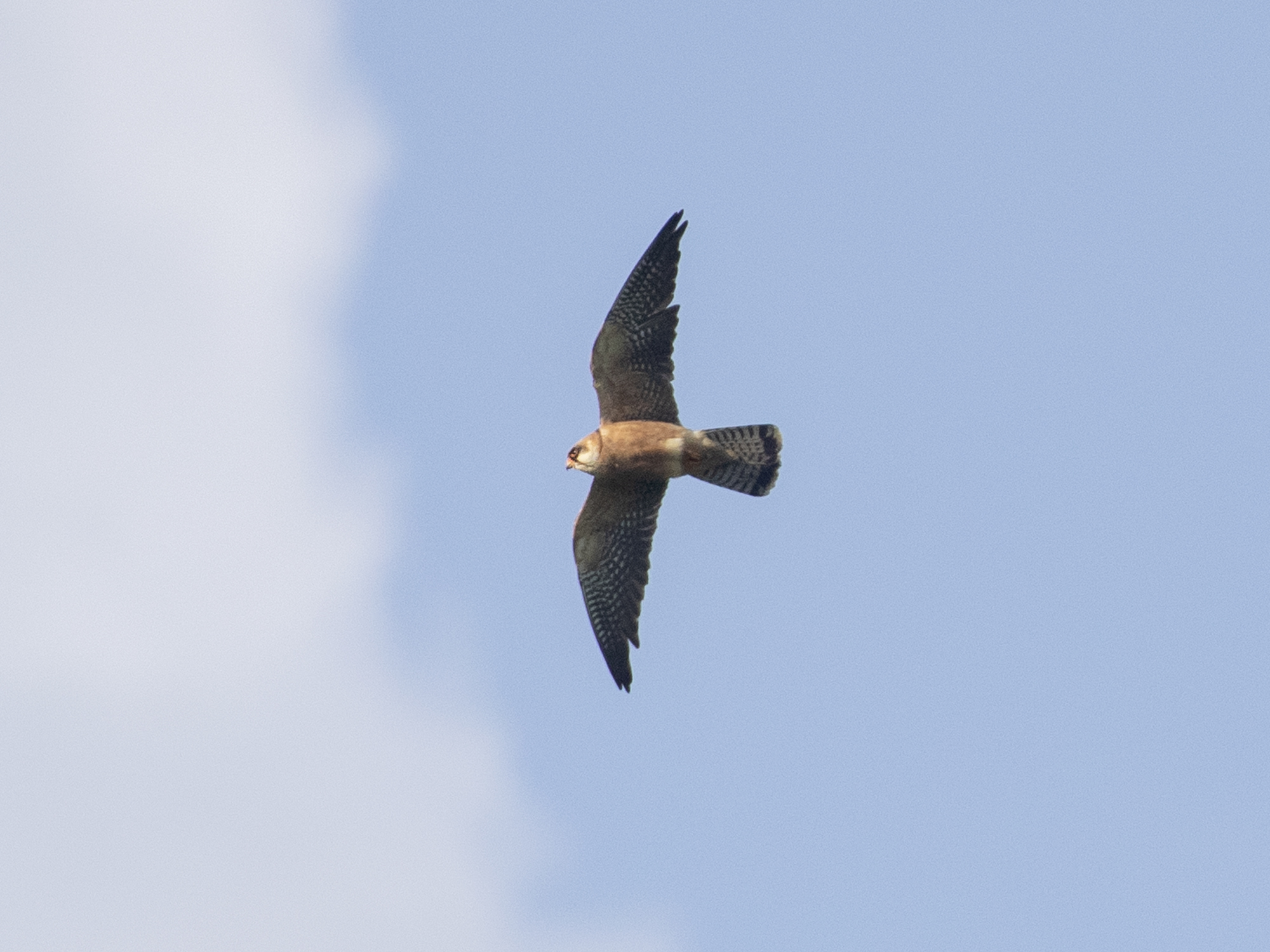 But today’s highlight came as I was walking home; a female Red–footedFalcon that flew North over Foxhill down, gained height over Broadlees bottom and continued North East.